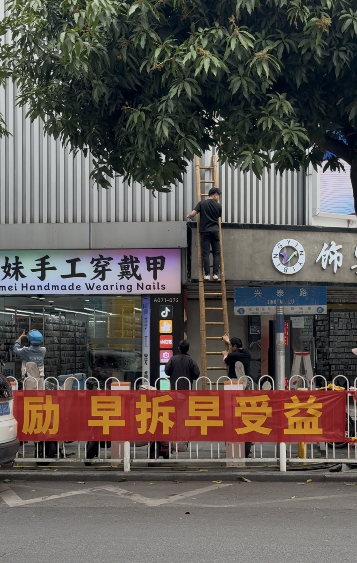 值得注意的是,当天兴发广场的建筑上陆续有工人挂出关于征拆的宣传标语,而在一旁的兴泰路沿线护栏上,诸如“早拆早受益”等内容的横幅也已挂上。